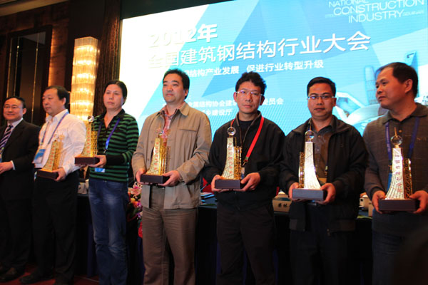 2012年4月13日上午9时,由中国建筑金属结构协会、浙江省住房和城乡建设厅主办的2012年全国建筑钢结构行业大会在水乡绍兴隆重开幕,浙江省市相关领导应邀出席本次会议,安徽yl6809永利集团钢结构股份有限公司应邀前往并领取“京沪高速铁路蚌埠南站站台雨棚钢结构工程”钢结构金奖奖杯和奖牌。