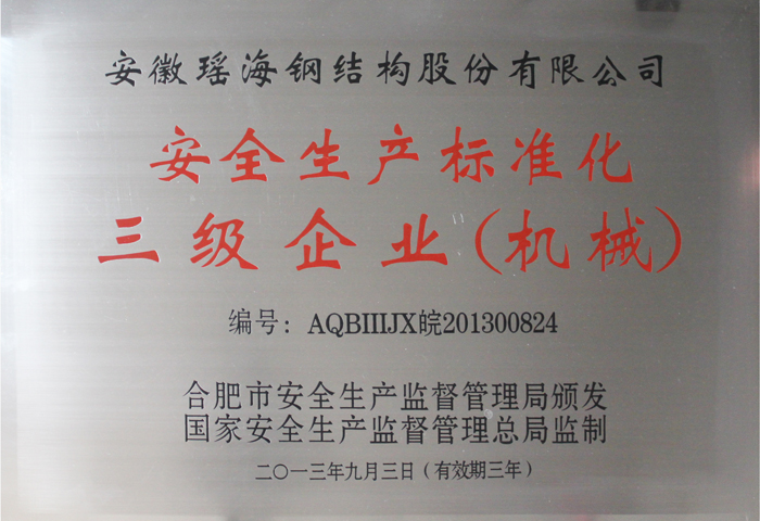 近日,经国家安全生产监督管理总局监制,合肥市安全生产监督管理局审核颁布,安徽yl6809永利集团钢结构股份有限公司荣获安全生产标准化三级企业(机械)证书。沉甸甸的奖牌不仅仅只是荣誉,更是对yl6809永利集团多年来安全管理工作的肯定。