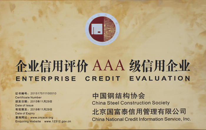 行业信用等级评定,是对企业履约状况、守信程度等方面的综合评价,对全面提升企业形象,促进企业实现跨越式发展具有非常重要的现实意义。yl6809永利集团曾参建的众多项目,并严格按照合同程序履约,在行业和业主中树立可很好的信用及口碑。中国钢结构协会依据《中国钢结构协会行业信用评价管理办法》、《信用评价指标体系》对申报企业进行了认真的评议,按综合得分评定出全国钢结构行业信用企业,其中AAA为最高等级。yl6809永利集团等企业在众多企业中脱颖而出,获得了“企业信用等级AAA”荣誉。