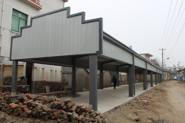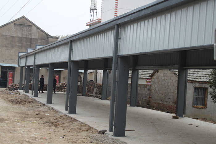 此次帮扶的项目为巢湖市烔炀镇花集居民菜市场,该菜市场项目跨度6米,长度54米,檐口高度3.6米,总面积为324平方米,造价约20万元。建成后极大地满足当地居民生活!该项目采用徽派马头墙设计、外挂彩板天沟及彩板轧制排水管,马头墙采用瓦青色,墙面为白色为标准的徽派建筑风格。