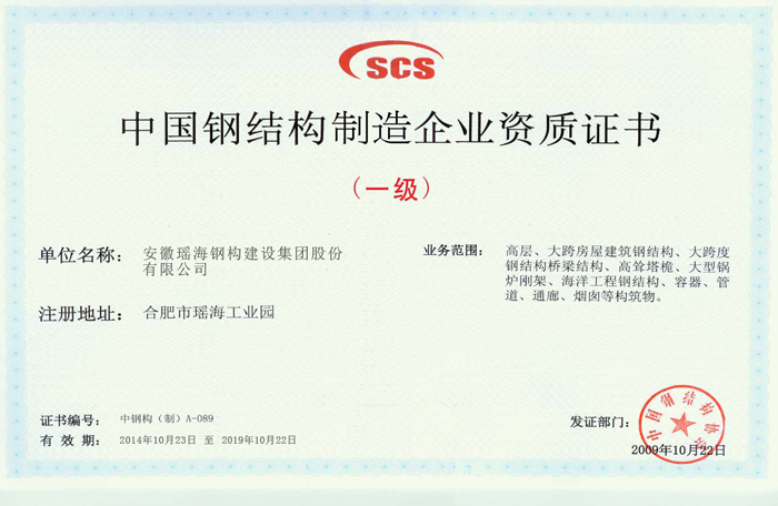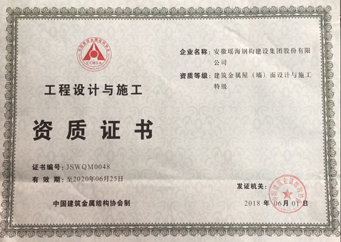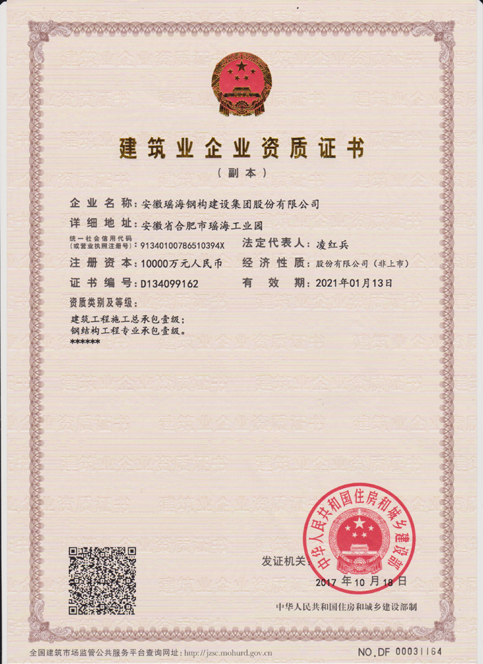 在获得荣誉的同时,yl6809永利集团的资质随之不断夯实和升级:2014年9月,合肥市明远公司房屋建设施工总承包贰级资质升级为壹级资质,2015年7月,安徽yl6809永利集团钢结构建筑设计研究有限公司获得建筑行业(建筑工程)乙级.....,截止到目前yl6809永利集团拥有房屋建筑施工总承包壹级资质、建筑行业(建筑工程)设计乙级、钢结构工程专业承包一级资质、钢结构制造一级资质、建筑金属屋(墙)面设计与施工特级、桩基基础二级资质,消防设施工程专业承包二级、市政公用工程施工总承包三级。