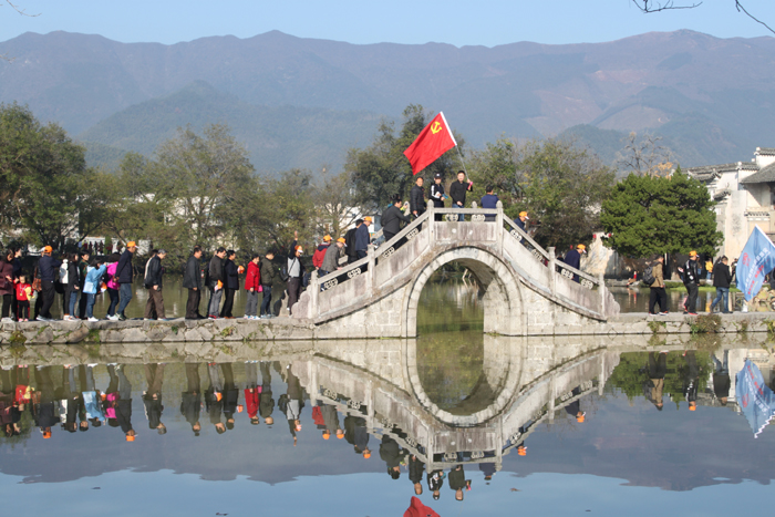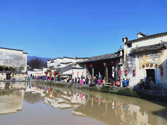 第三站黟县宏村,宏村始建于北宋,距今已近千年历史,原为汪姓聚居之地。古宏村人独出机抒开"仿生学"之先河,规划并建造了堪称"中华一绝"的牛形村落和人工水系,统看全村,就象一只昂首奋蹄的大水牛,成为当今"建筑史上一大奇观"。全村现保存完好的明清古民居有140余幢。村内鳞次栉比的层楼叠院与旖旎的湖光山色交相辉映,动静相宜,空灵蕴藉,处处是景,步步入画。从村外自然环境到村内的水系、街道、建筑,甚至室内布置都完整地保存着古村落的原始状态,没有丝毫现代文明的迹象。造型独特并拥有绝妙田园风光的宏村被誉为"中国画里乡村"。