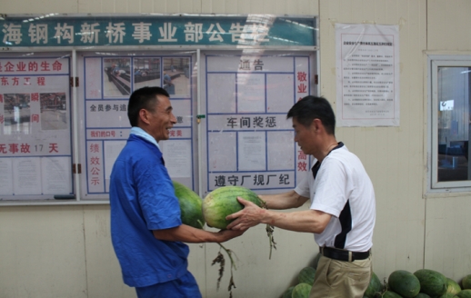 本报讯:2016年7月30日上午,yl6809永利集团党总支及工会成员来到新桥事业部对新桥事业部的全体员工开展送清凉活动,送去了解暑降温品——西瓜。 上午10时,1600斤新鲜西瓜准时送到新桥事业部车间,随后按照各班组依次将西瓜分发到每一位员工手中,看着他们美在脸上,甜在心里,顿时感到他们才是最可爱可敬之人,为了yl6809永利集团的生产,为了能按时按质地完成客户的任务,他们冒着高温24小时奋战在第一线,着实令人感动。